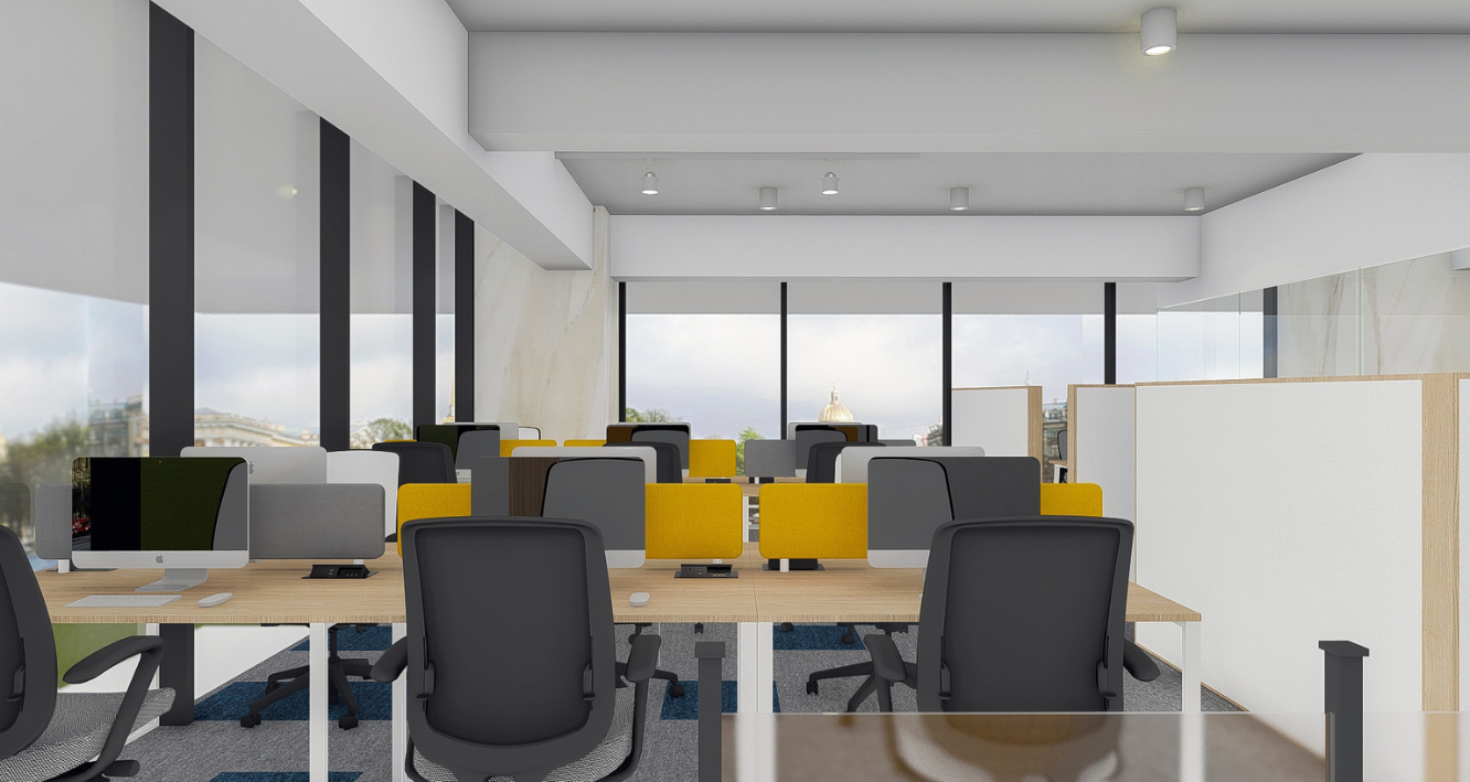 The room is predominantly white with bright orange accents and warm wood materials. The room was designed to create a cosy and modern space.