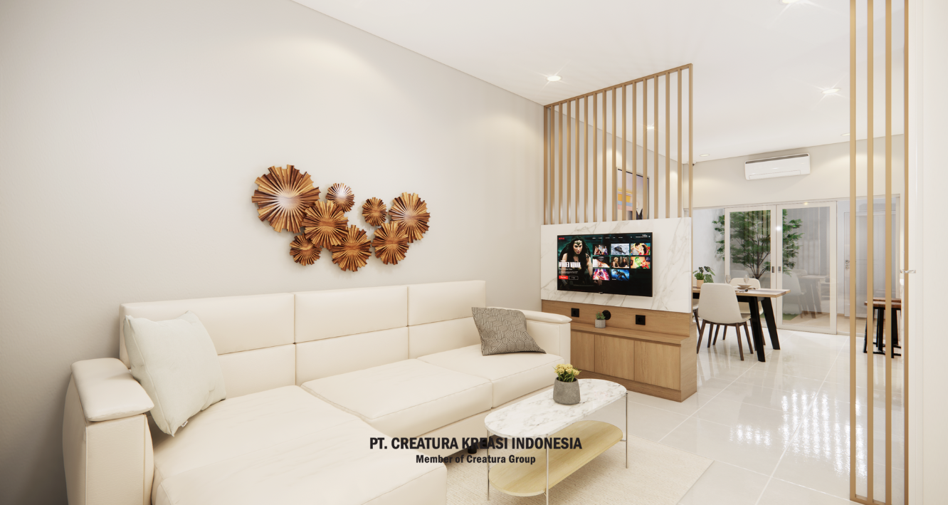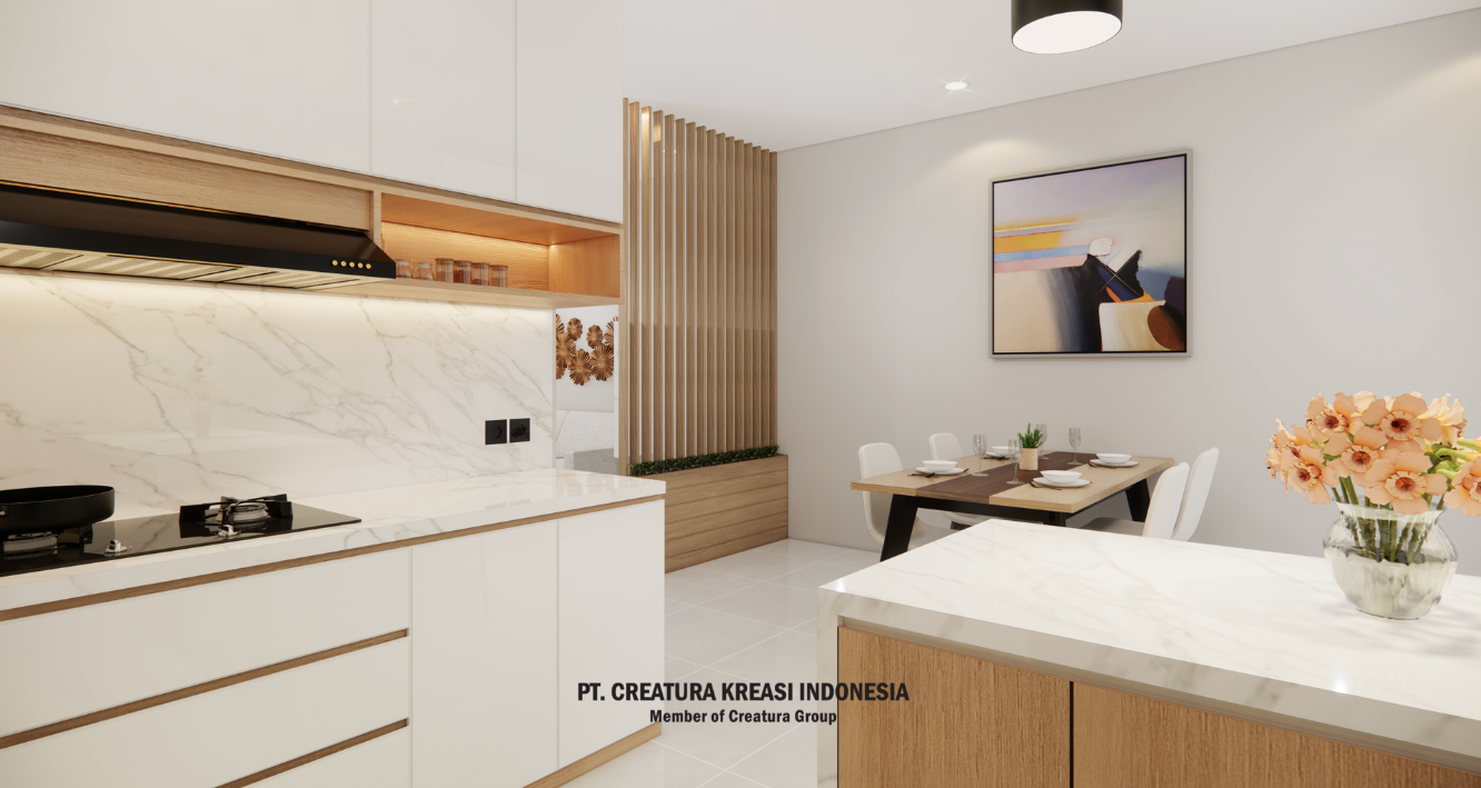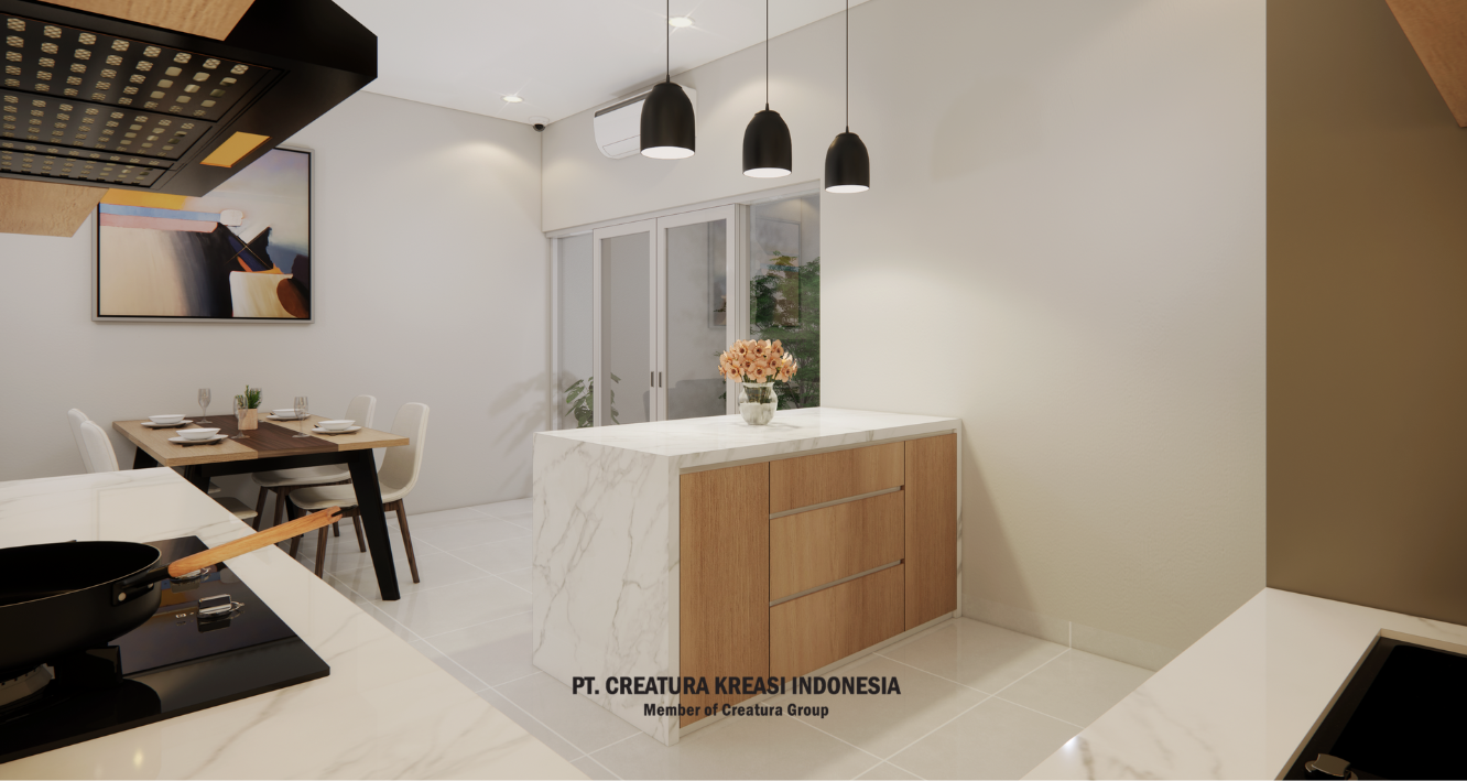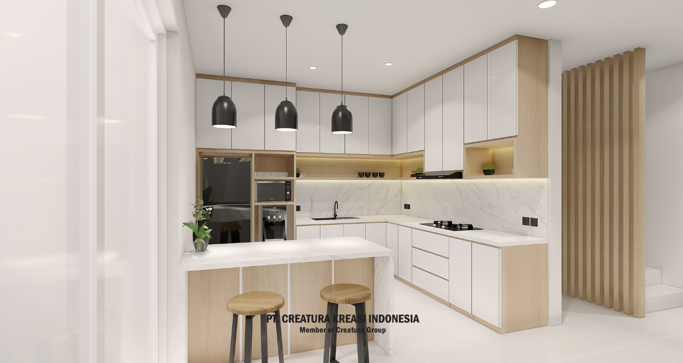 An interior design project that includes a kitchen, dining room, service area, and living room with an open plan concept. The design emphasizes on functionality and aesthetics, with the kitchen and dining area being multifunctional and located near windows or doors to maximize natural air circulation. The color palette used is neutral such as black, white, brown and beige with a light brown wooden dining table and clean white painted walls. There is also a minibar table and high chairs near the kitchen cabinets to create a cozy and modern social space.