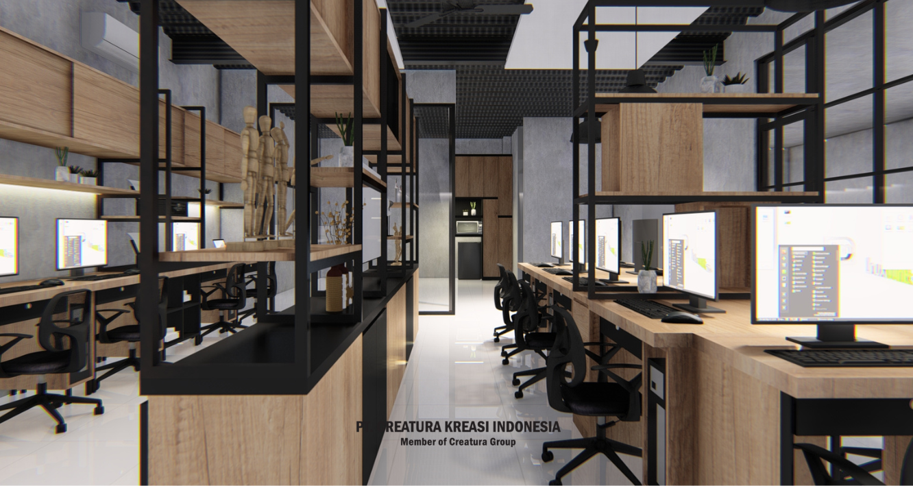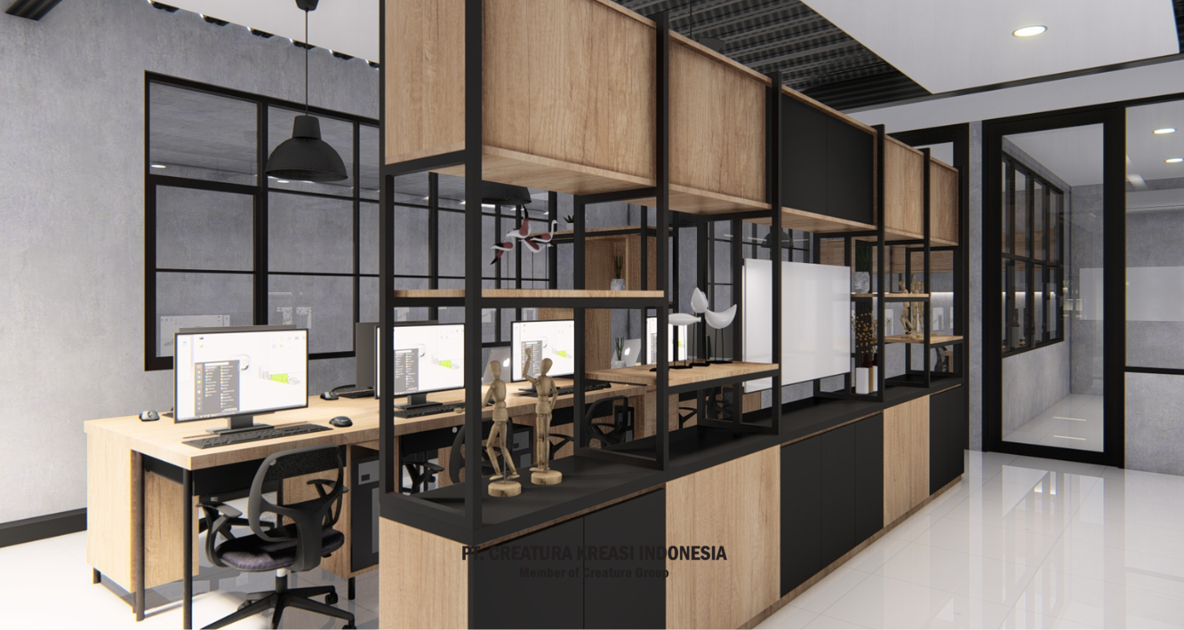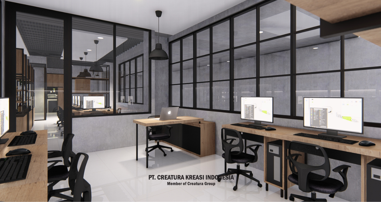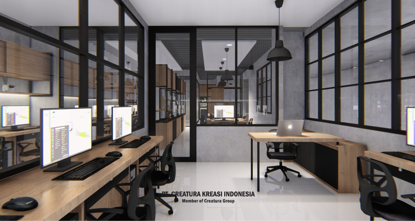 This industrial-modern office brings together raw textures and clean lines-polished concrete, sleek black frames and warm wood finishes. Glass partitions create a sense of openness and connectedness while still providing space for each team. With dedicated desks and a smart layout, it's the perfect setting for creative minds to focus, collaborate and thrive.