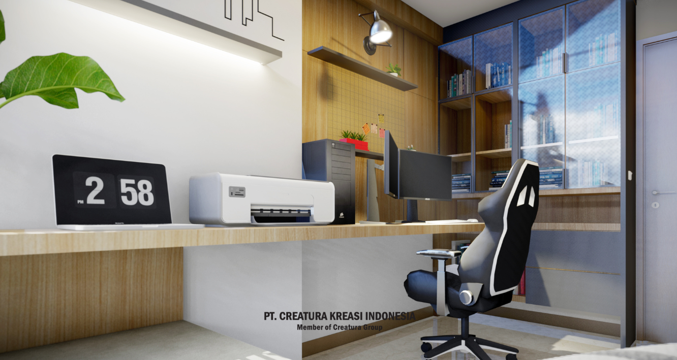 Embracing a minimalist style with natural wood accents and optimal lighting, this space offers a warm yet professional atmosphere. The use of multifunctional furniture enhances space efficiency without compromising aesthetics making it an ideal choice for modern apartment living that prioritizes comfort and productivity.