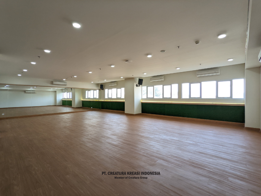 The sports facilities at Bunda Mulia School include a gym floor, sports classrooms, waiting area, reception, playground, library and auditorium. All these facilities are designed for free access for students according to their needs. The gym floor is focused on weights, while the gym classrooms are customized for various activities such as ballet and yoga. This design ensures that all students' sports and physical activity needs can be met in a supportive and functional environment.