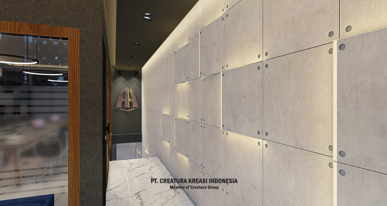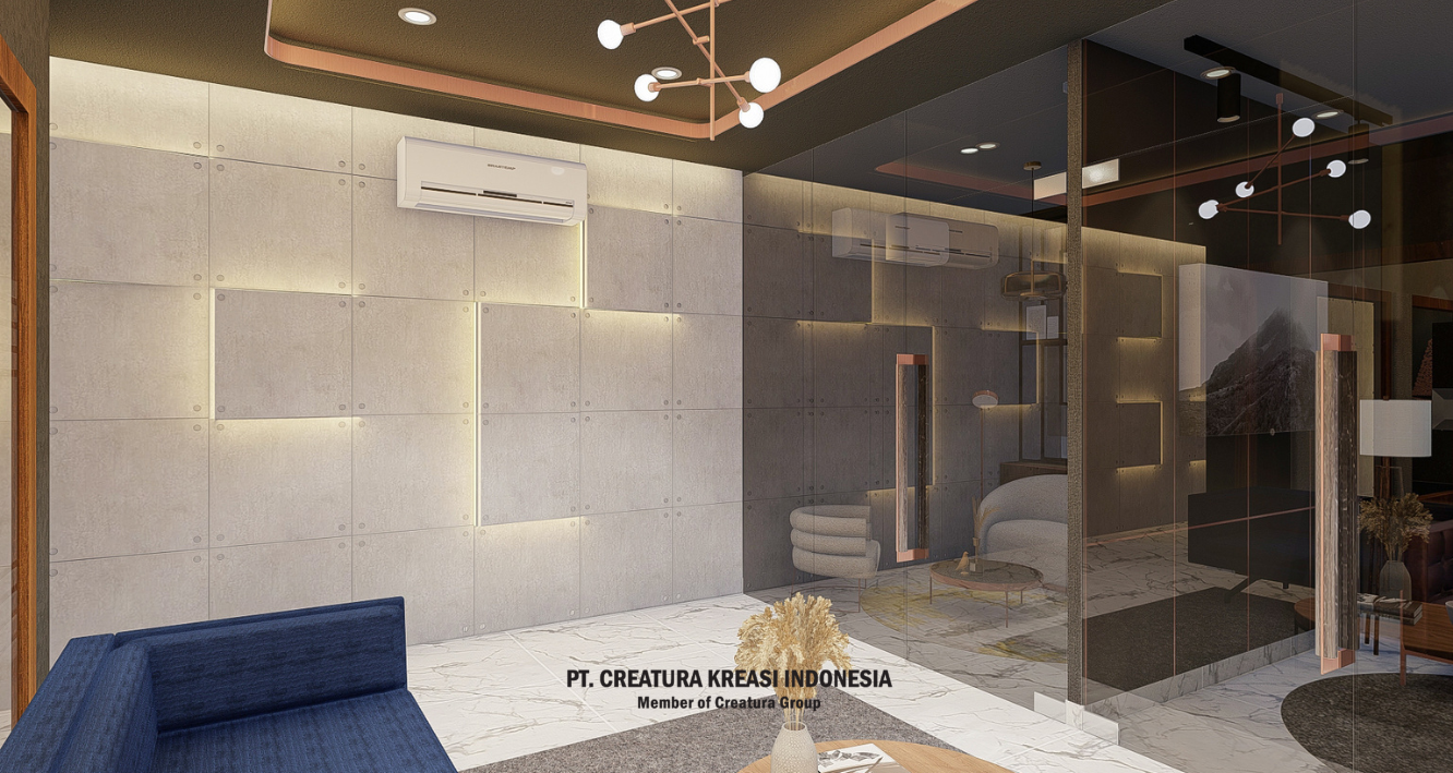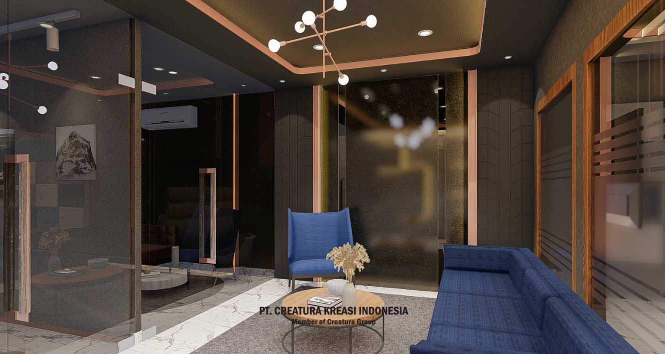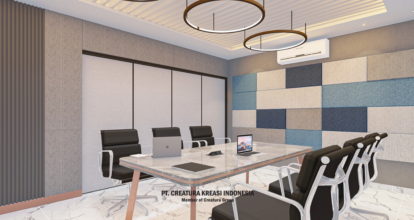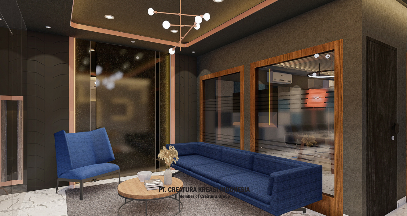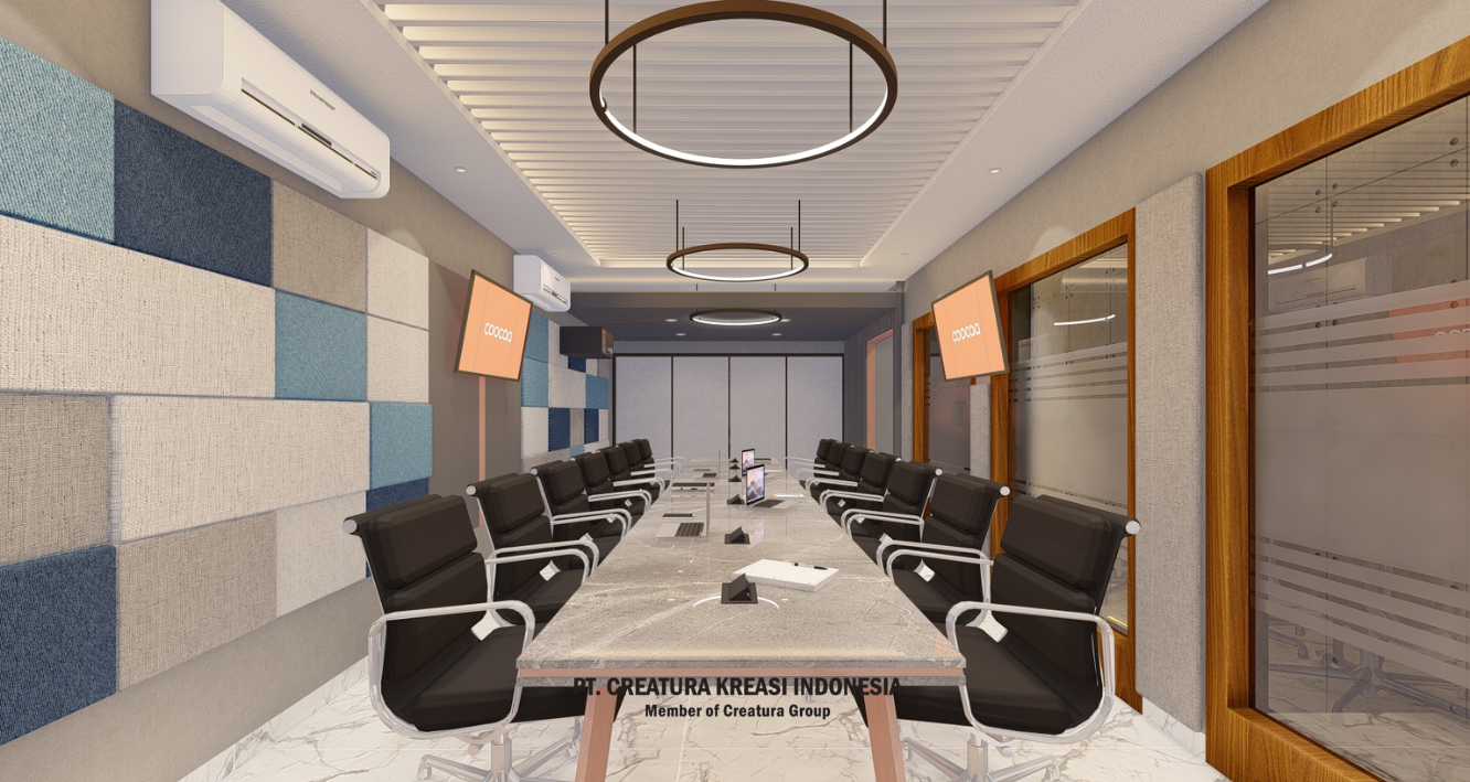 This office project includes the design of a large-capacity meeting room, waiting area, and workspace equipped with a pantry. The office logo is placed at the front as the visual identity of the company. The design prioritizes functionality, comfort, and a professional image.