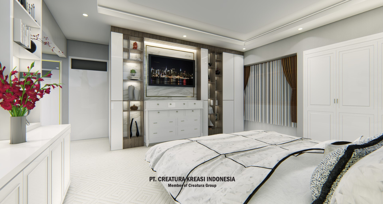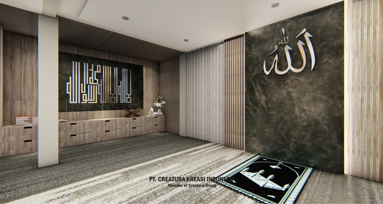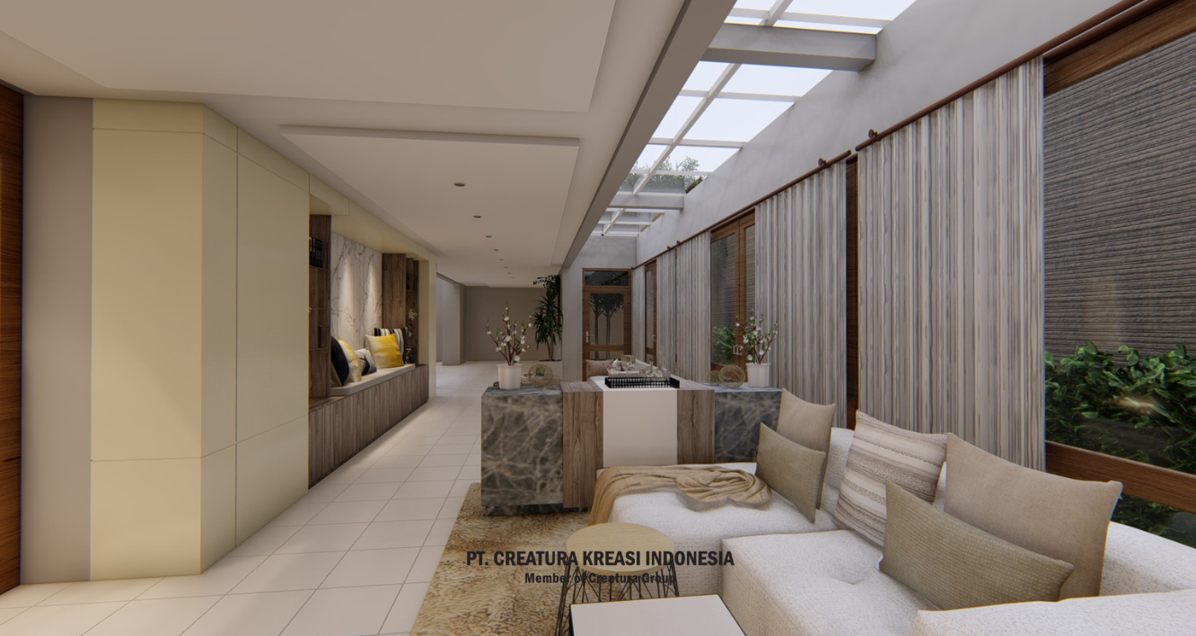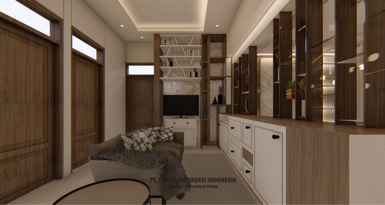 A project to design a relaxing area in the living room and corridor. It has a color theme of white, cream and brown. There is a prayer room that is designed modern with a luxurious look. There is also a room that looks spacious in white with a touch of brown color.