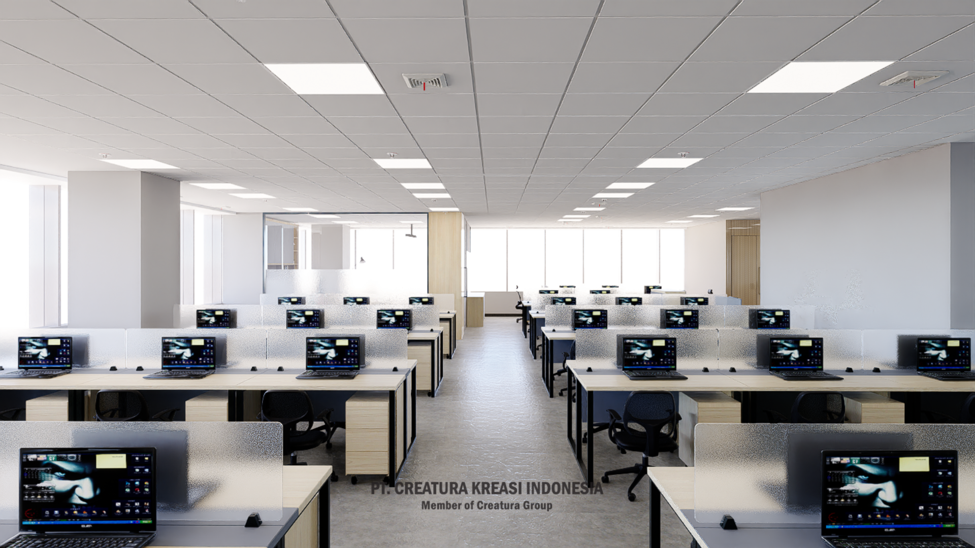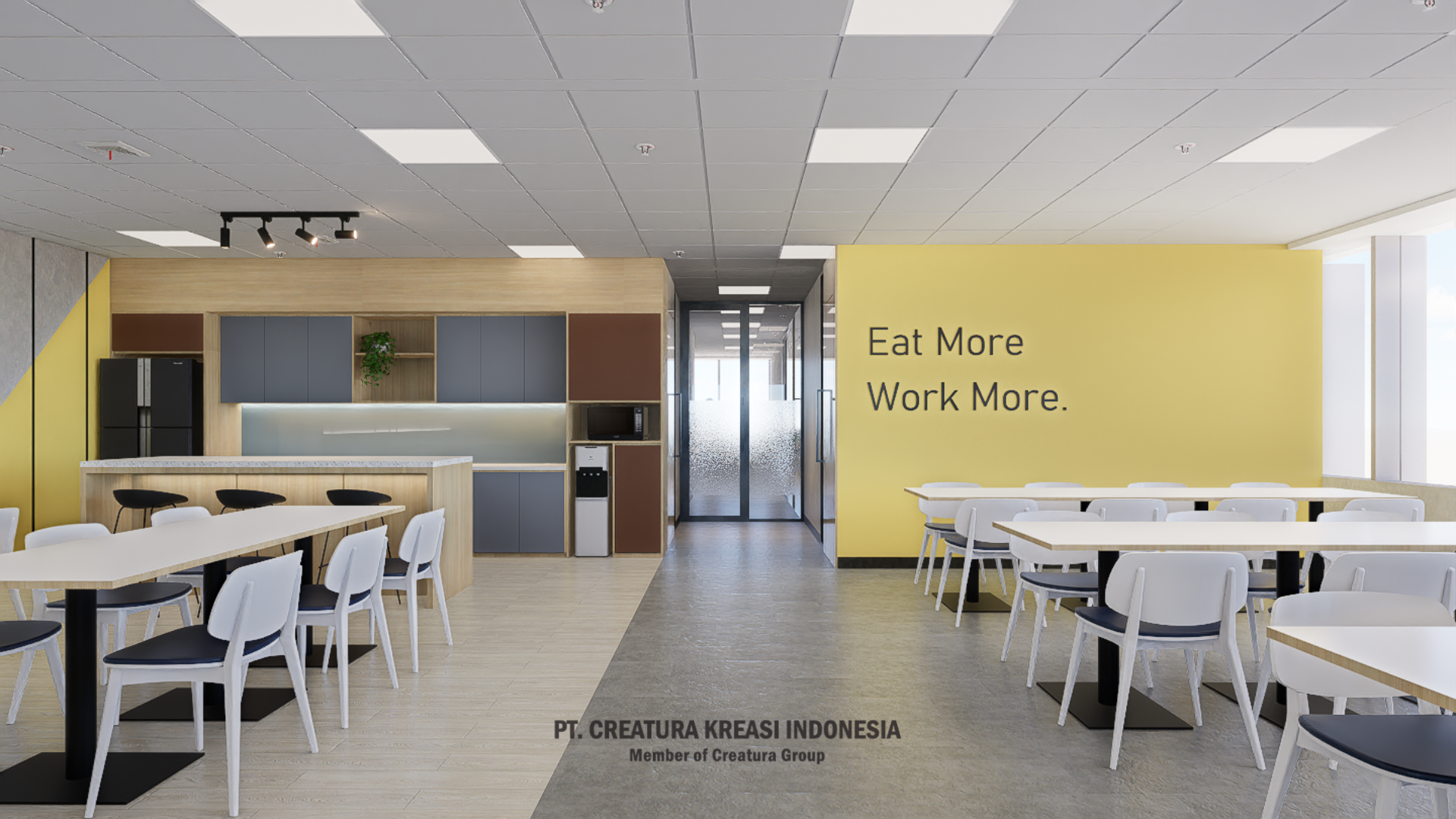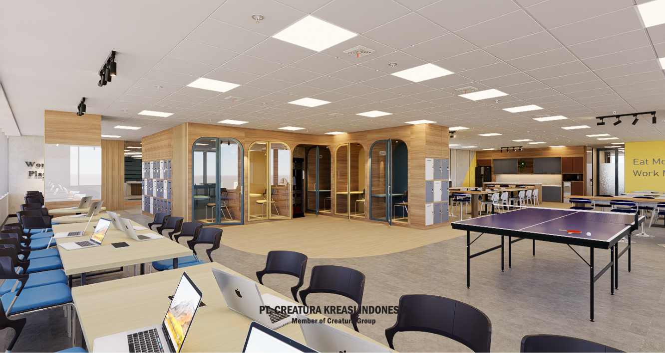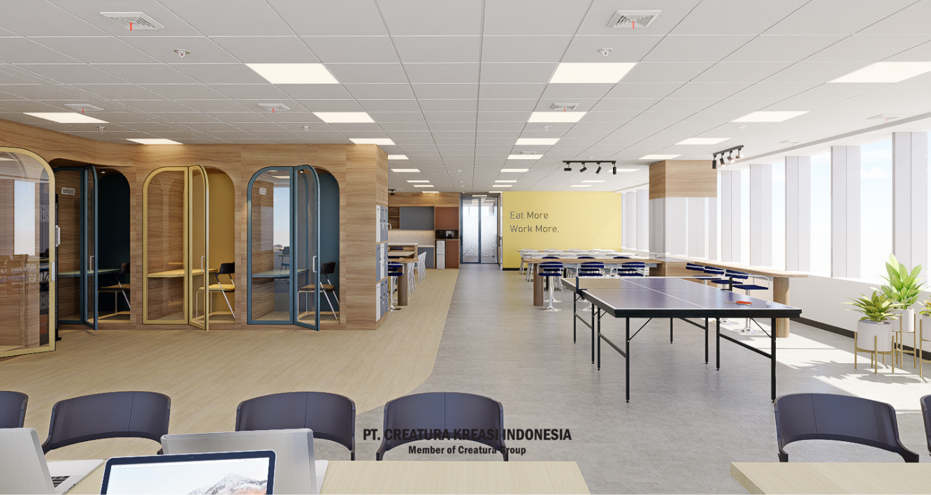 The office is designed with a modern, dynamic and collaborative workspace concept, which supports productivity and creativity. Flexible spaces for various needs, such as meetings and collaboration, are available. Neutral colors (white, grey, beige) create a calm atmosphere, with a touch of bright yellow for added energy. Comfortable breakout spaces are available to support a balance of work and rest.