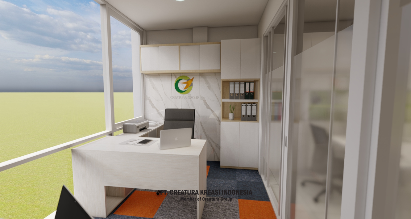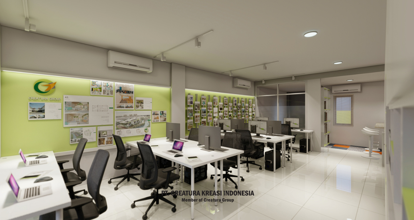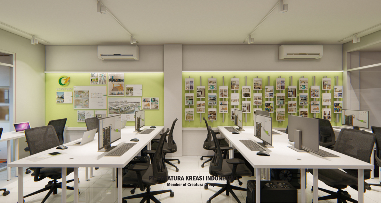 Interior design project for an office inside a shophouse that includes a workspace, reading area, and mini pantry. The workspace is divided into two parts: a shared work area (public) and a private area, separated by a partition. In addition, designing a panel to display the works that have been created and a wall in the workspace that can be used for discussion, adds to the functionality and aesthetics of the space.
