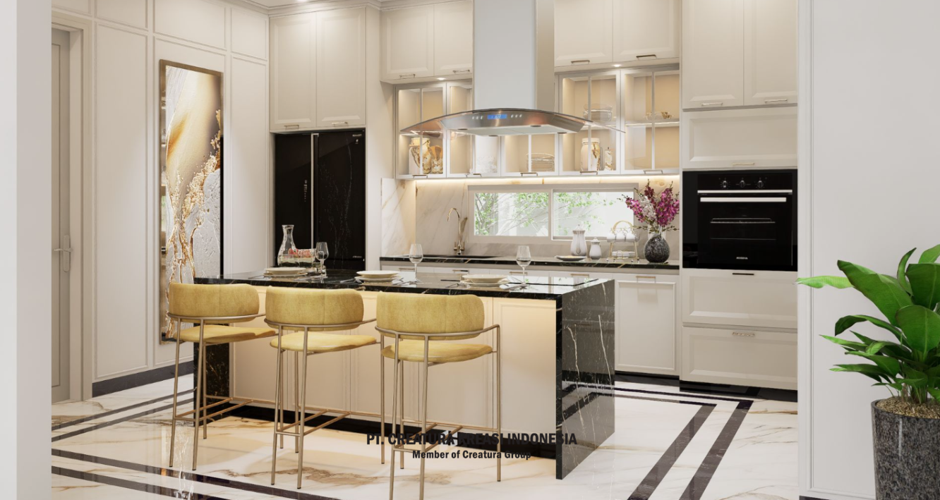 This kitchen has a modern minimalist style with a clean white colour on the walls and cabinets. The marble floor with black and white contrast pattern adds a luxurious impression. The kitchen island with white countertop and gold bar stools is the main focus of the kitchen.