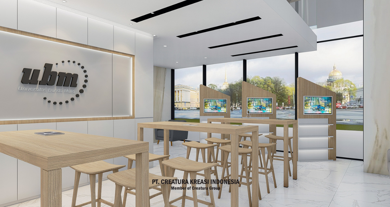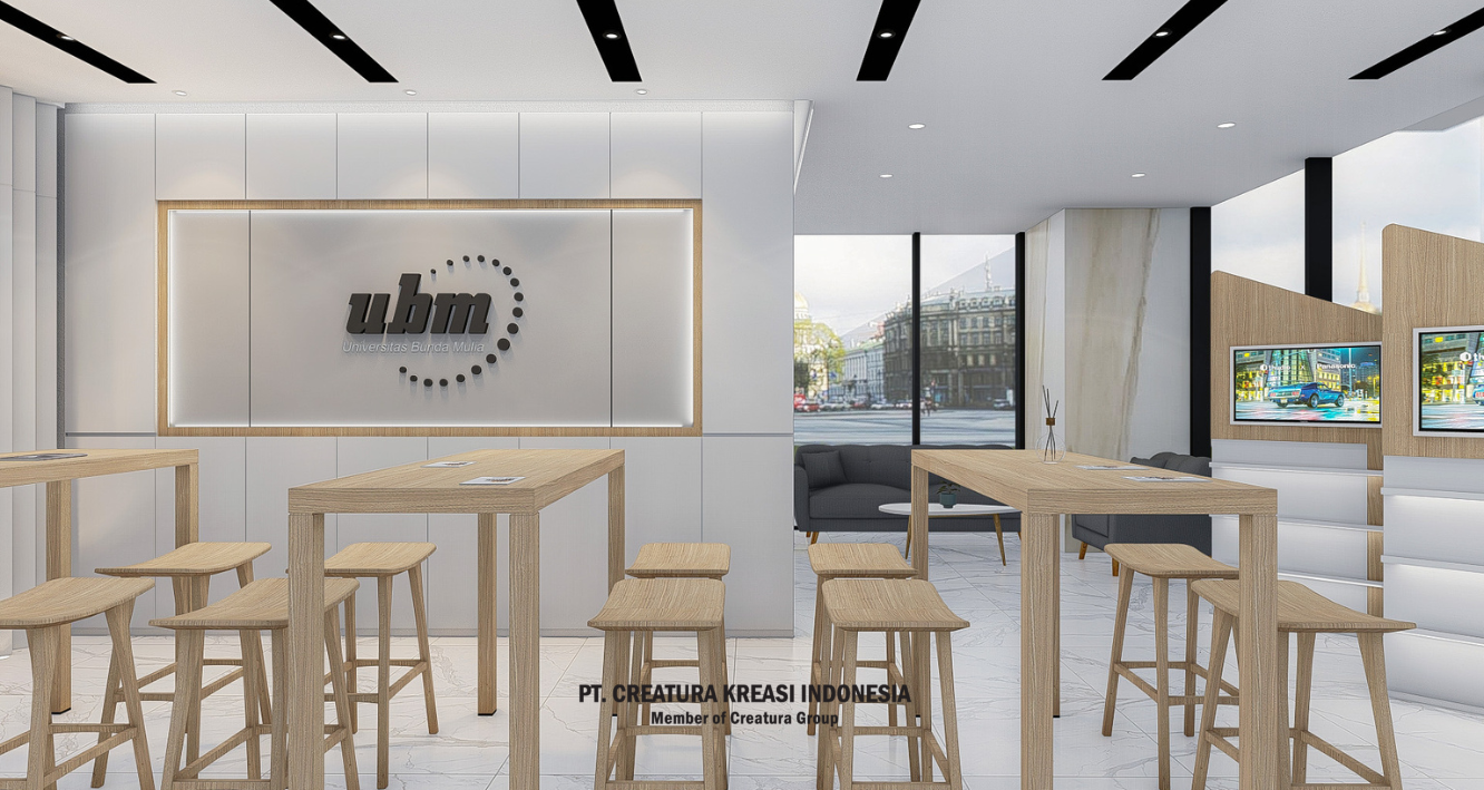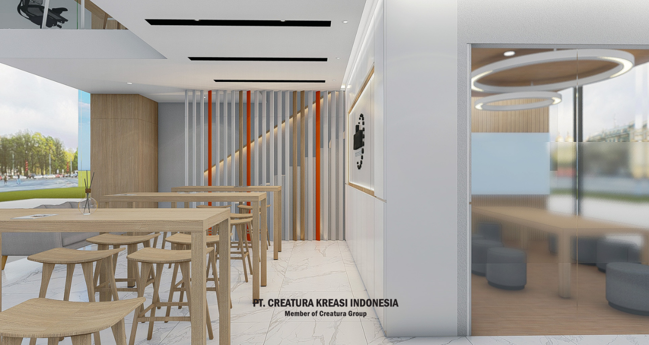 The room is predominantly white with bright orange accents and warm wood materials. The room was designed to create a cosy and modern space.