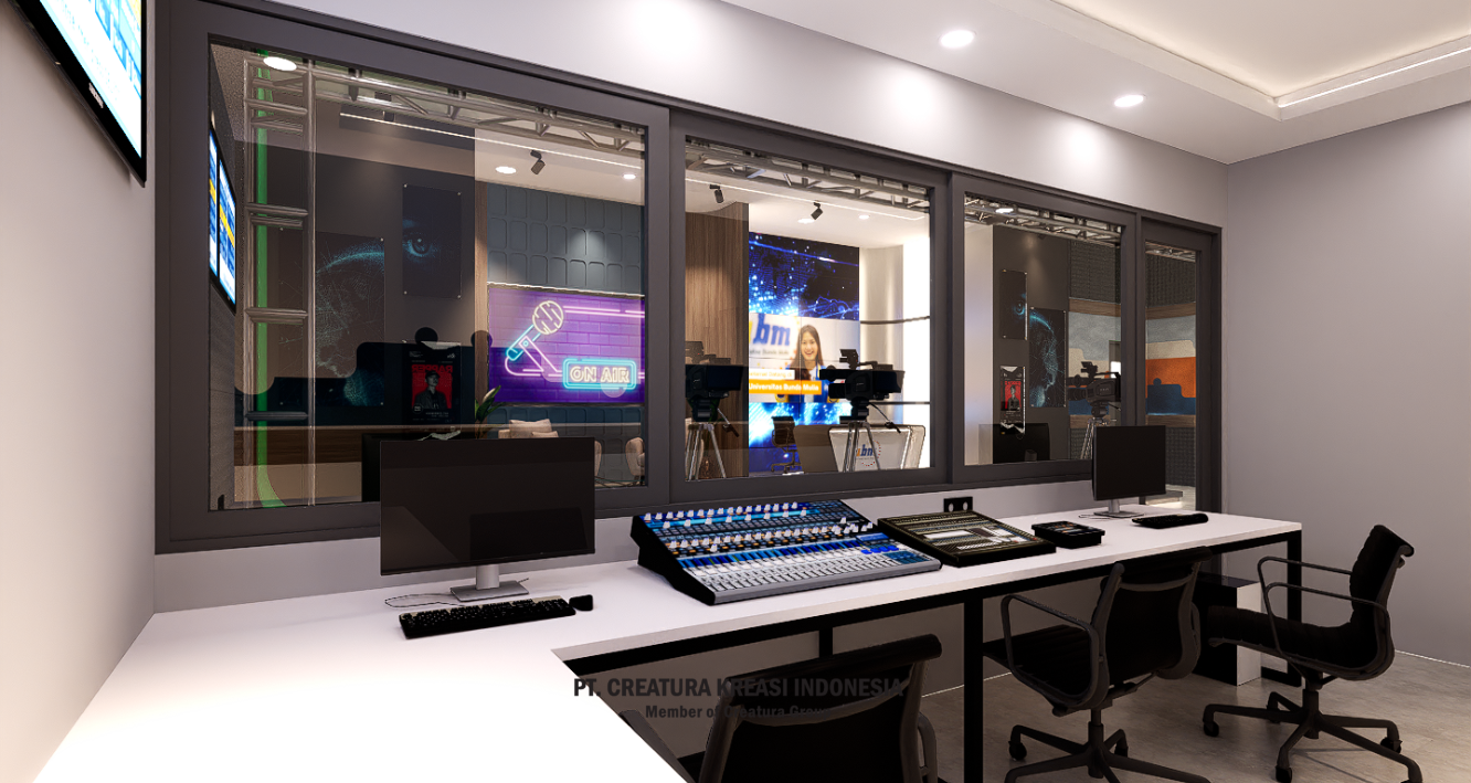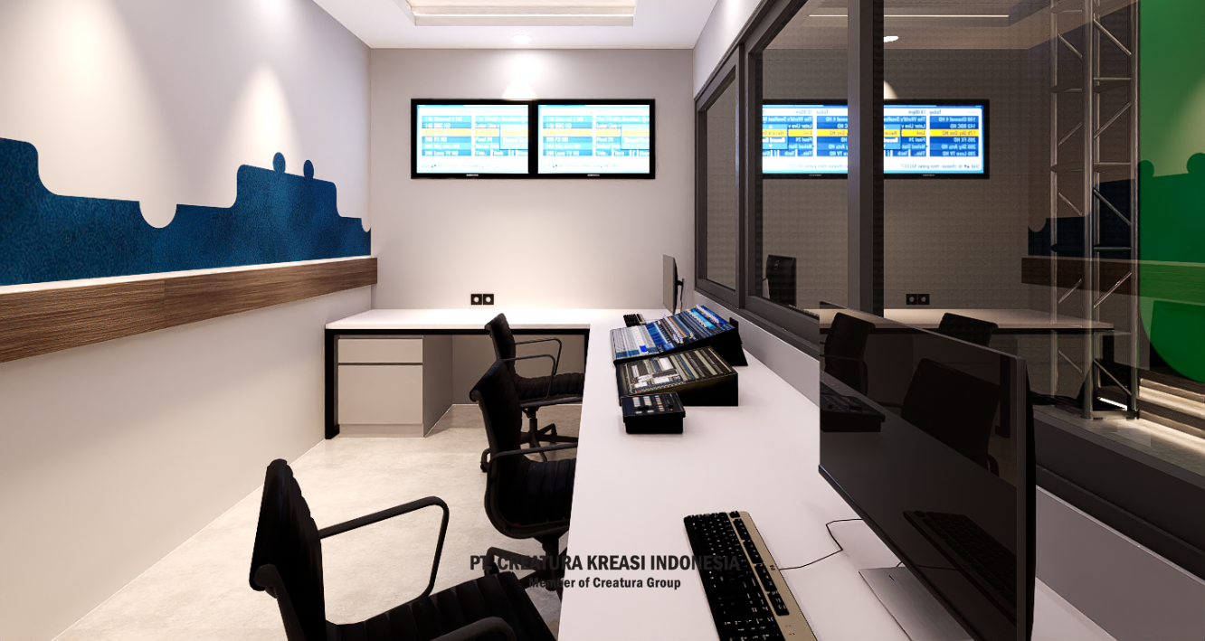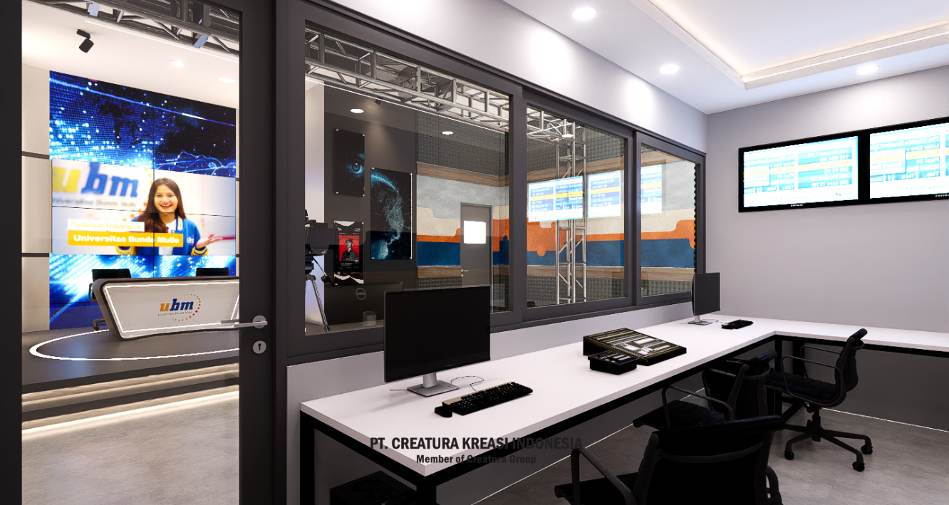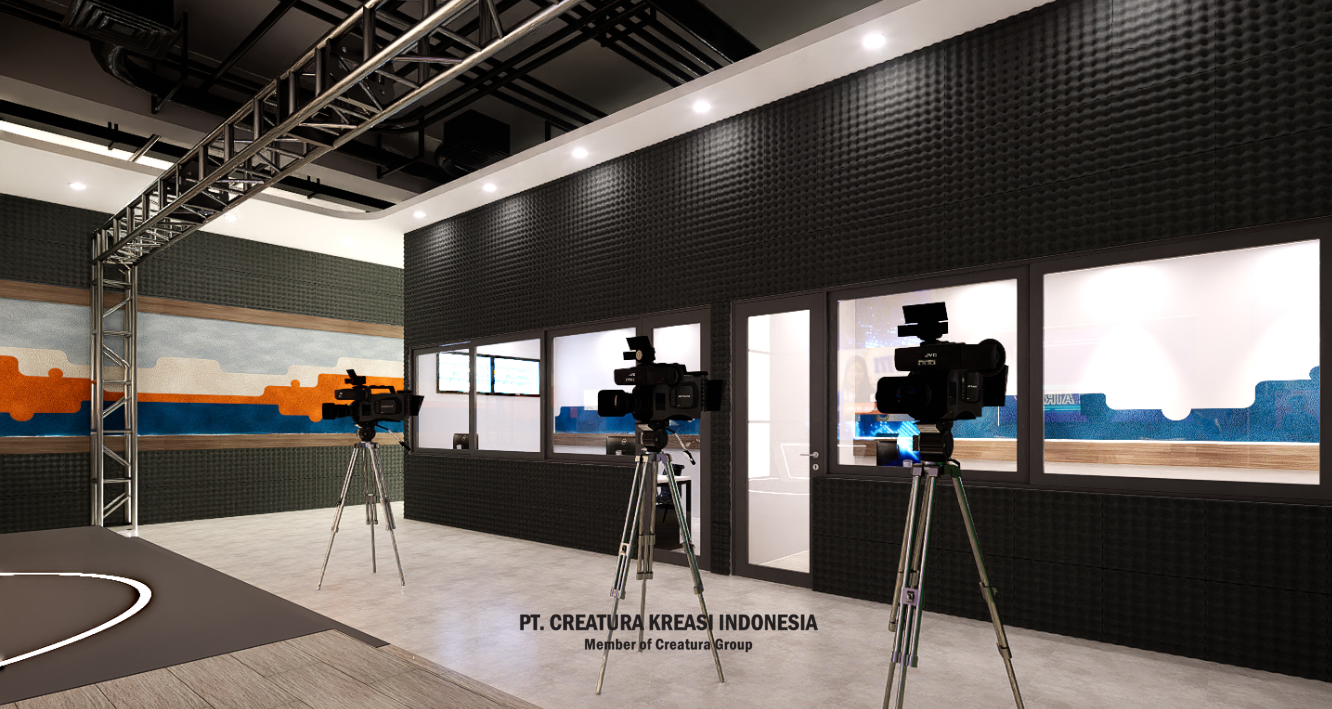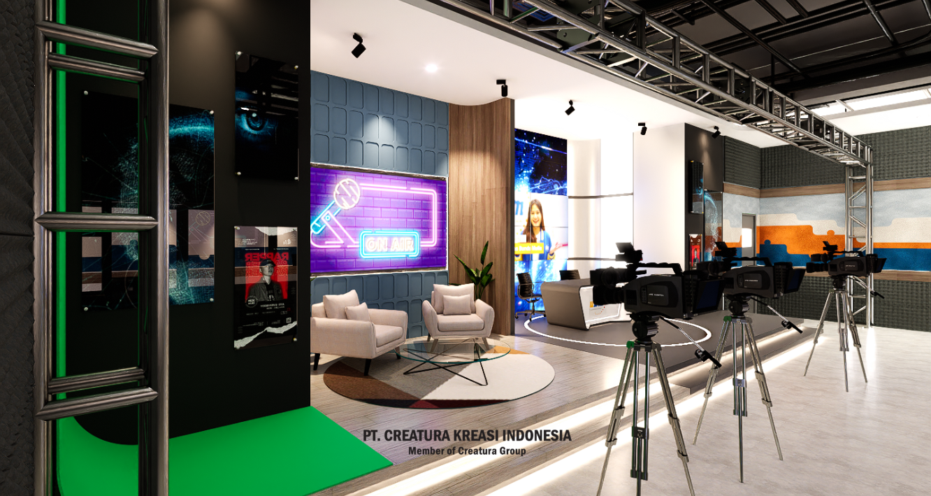 A well-designed and fully equipped television studio, used for various types of video production, such as news, interviews, presentations and digital content. The combination of lighting, décor and technology creates a dynamic and engaging atmosphere.