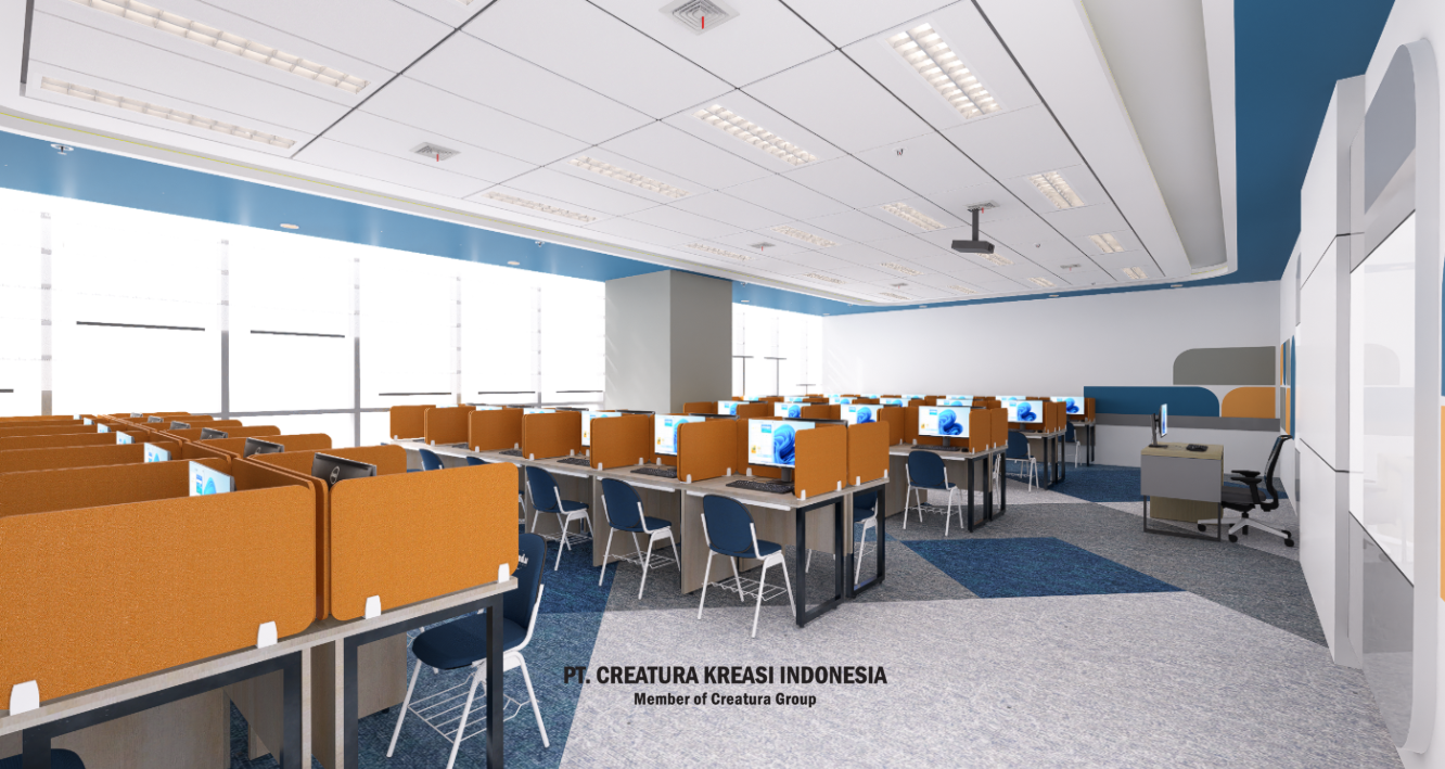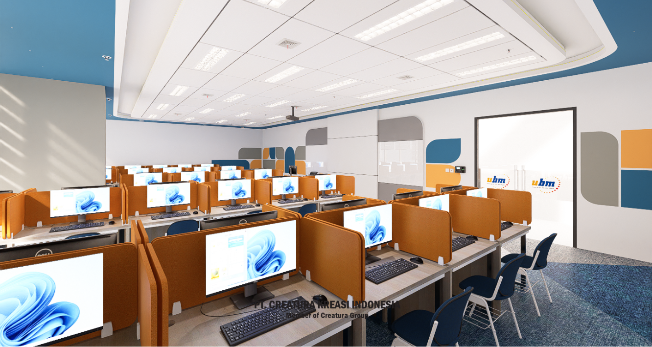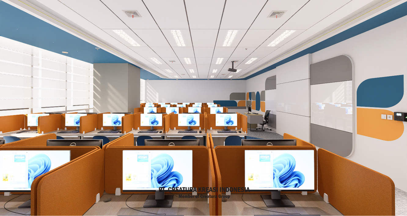 The computer lab is used for learning and training activities. The room is clean, organized, modern and the use of bright colors is designed to provide a conducive learning environment.