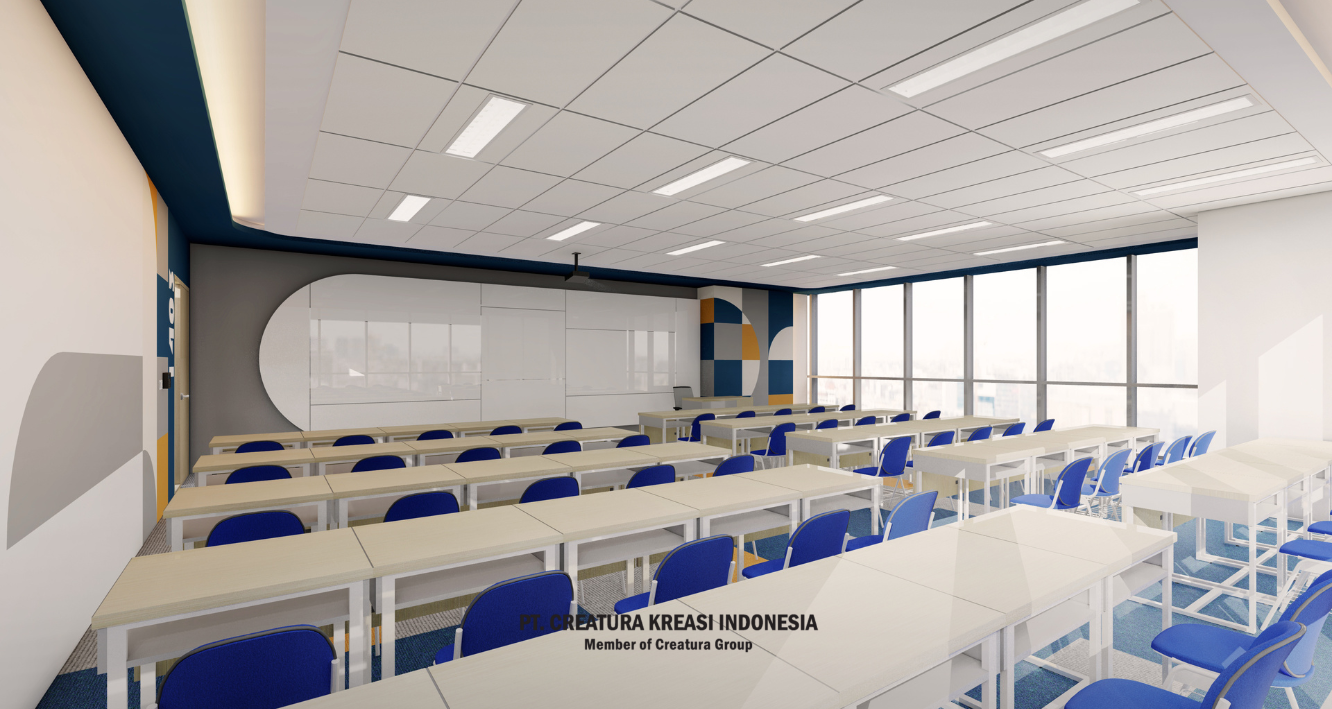 a modern classroom designed for interactive and collaborative learning. bright colors, interesting murals, and a neat layout create a fun atmosphere while learning.