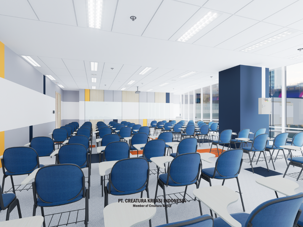 This bright-looking room is designed to create an interactive and collaborative learning environment. The chairs feature an ergonomic design with a blue backrest and gray seat, complemented by a small folding table.