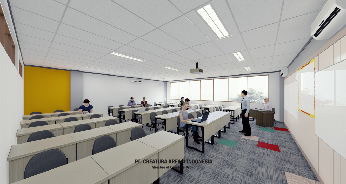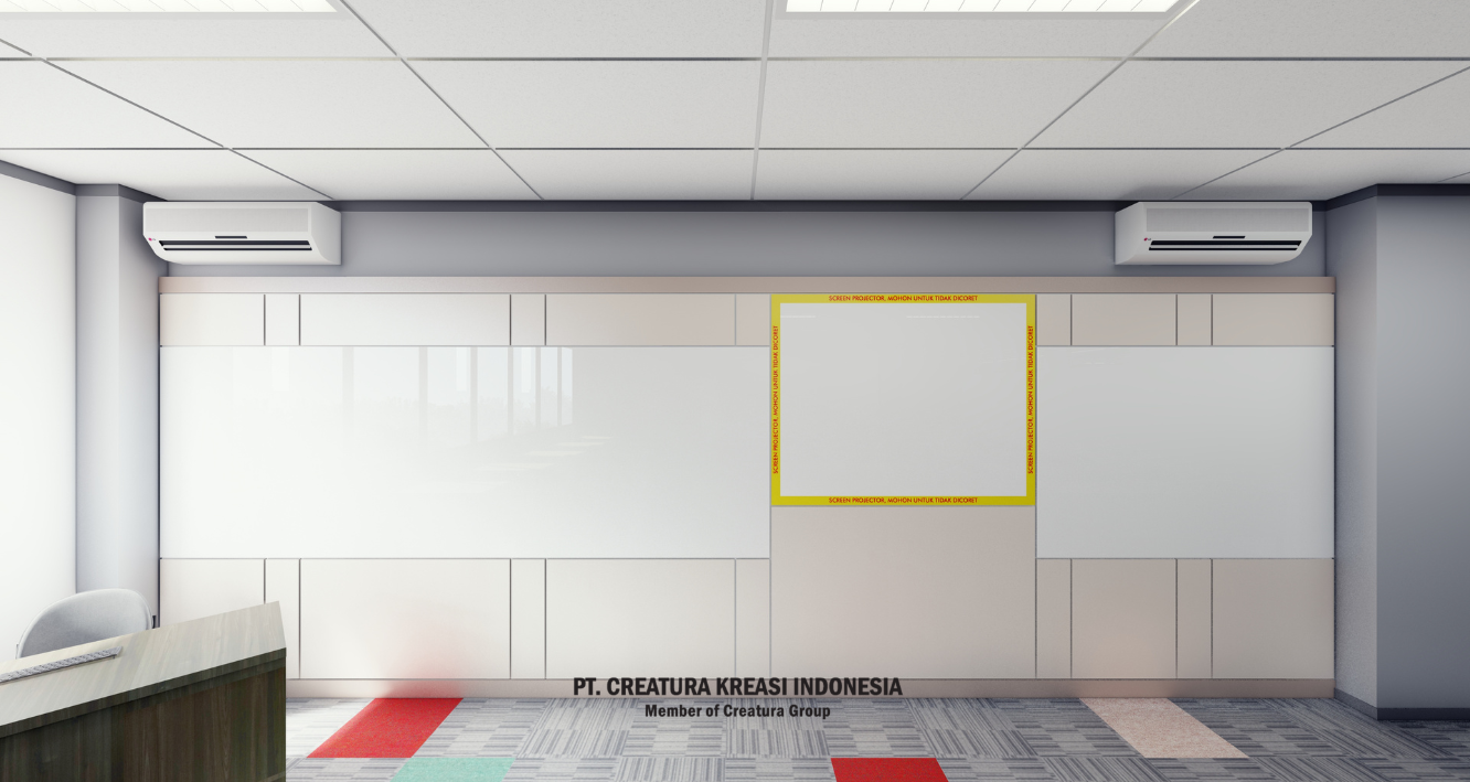 modern classroom back wall design. Its functional and minimalist design, combined with a touch of bright color, creates a productive and comfortable space.
